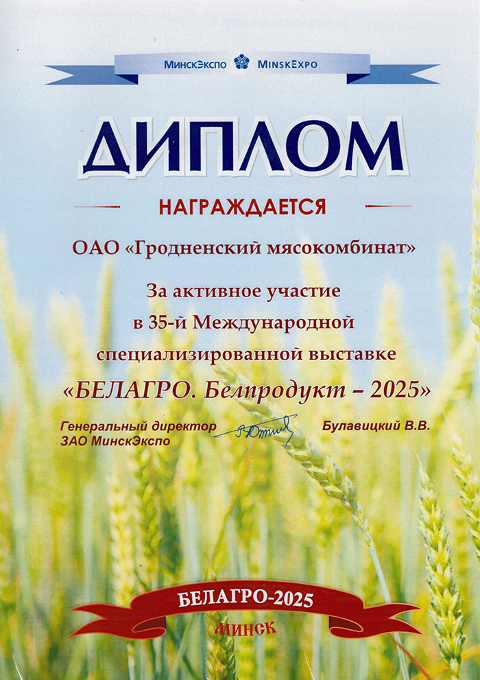 ОАО «Гродненский мясокомбинат» - флагман мясоперерабатывающей отрасли Беларуси. Более чем за столетие своего существования ОАО «Гродненский мясокомбинат» превратился из небольшого регионального предприятия в лидера мясного рынка страны. Сегодня компания обладает крупнейшими в регионе производственными мощностями и формирует стандарты качества, которым следуют конкуренты. Мясокомбинат предлагает широкий ассортимент, охватывающий колбасы, ветчину, готовые мясные изделия и деликатесы, удовлетворяет запросы самых требовательных покупателей.